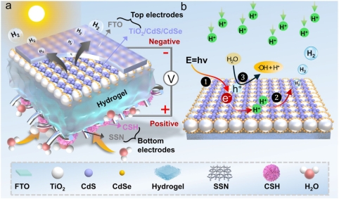 传统湿气发电器(MEG)在长时间运行中容易出现离子浓度梯度饱和与输出性能衰减,严重限制了器件的稳定性与持续发电能力。针对这一难题,课题组提出了光-湿协同驱动的光子型湿气发电机(P-MEG),构建出兼具光吸收与湿气调控功能的“三层结构”。该器件由CdS/CdSe量子点敏化TiO₂光敏层、电解质水凝胶层与CSH吸湿层组成,可在光照下实现光能与湿气能的协同转化。光生载流子在电极界面上驱动H⁺还原为H₂,从而动态重构两电极间的离子浓度梯度,持续维持高效电势差,实现稳定输出。