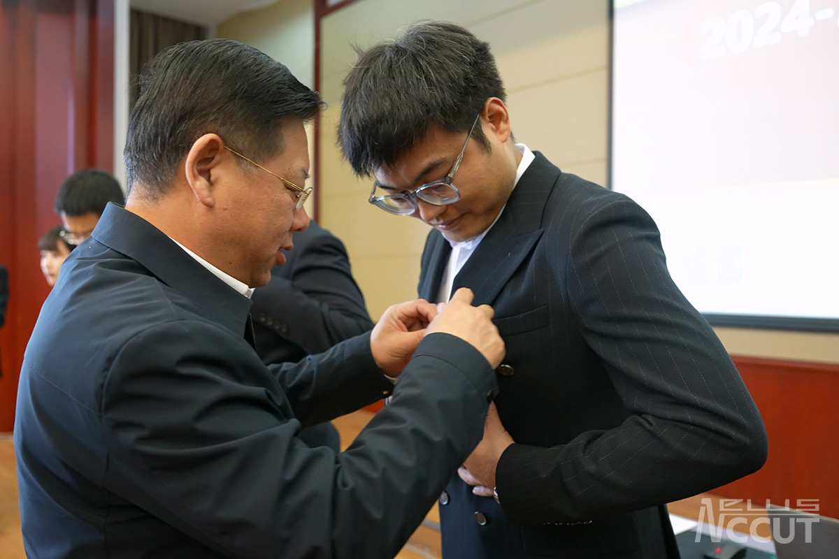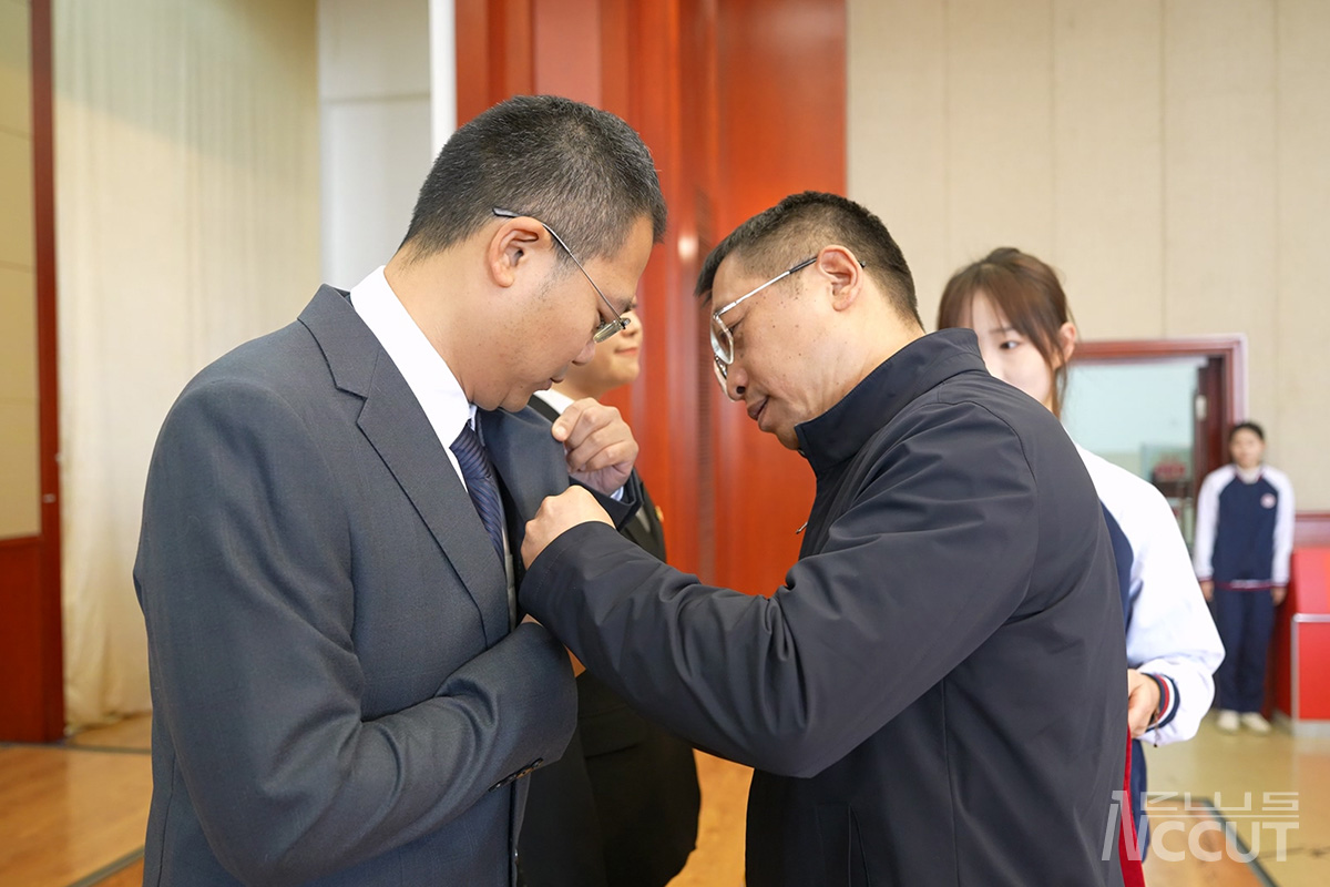 在全场热烈掌声中,陈权与付跃刚为新入职教师代表佩戴校徽。一枚枚闪耀的校徽,不仅象征着“工大人”的身份认同,更承载着“爱国敬业、求实创新”的校训精神,寄托着学校对青年教师立德树人、砥砺前行的殷切期望。