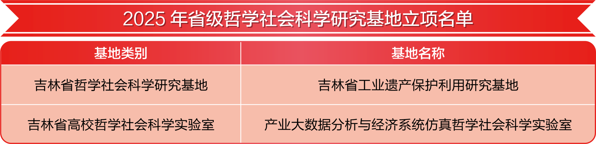有组织推动完成吉林省哲学社会科学重点研究基地总体规划论证和基地重大项目申请,加强省级哲学社会科学基地建设,2025年获批吉林省哲学社会科学研究基地、吉林省高校哲学社会科学实验室。