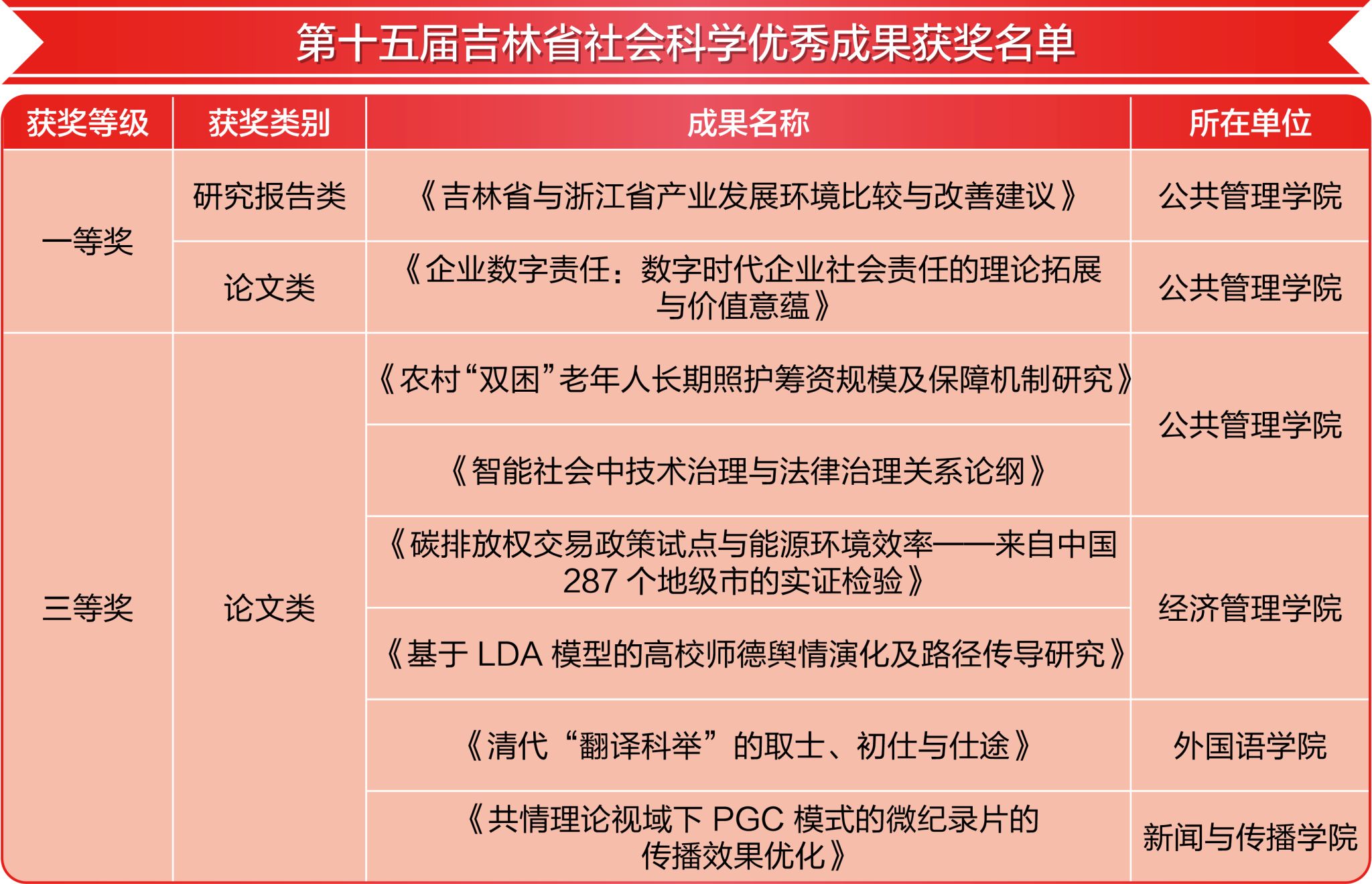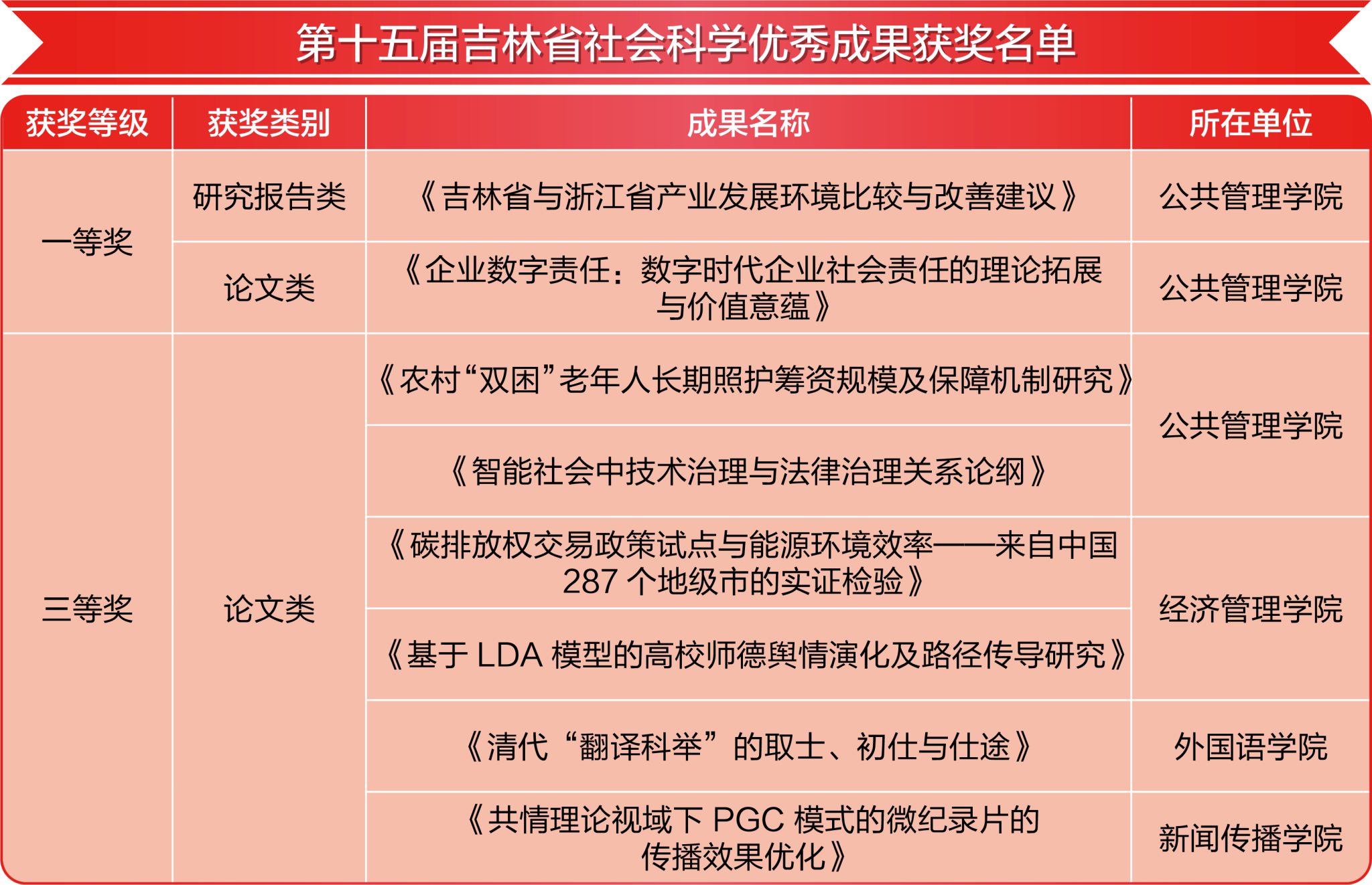 在第十五届吉林省社会科学优秀成果评奖中,共获8项奖励,包括一等奖2项、三等奖6项,实现了我校吉林省社会科学优秀成果奖一等奖“零”的突破,获奖数量创历史新高。