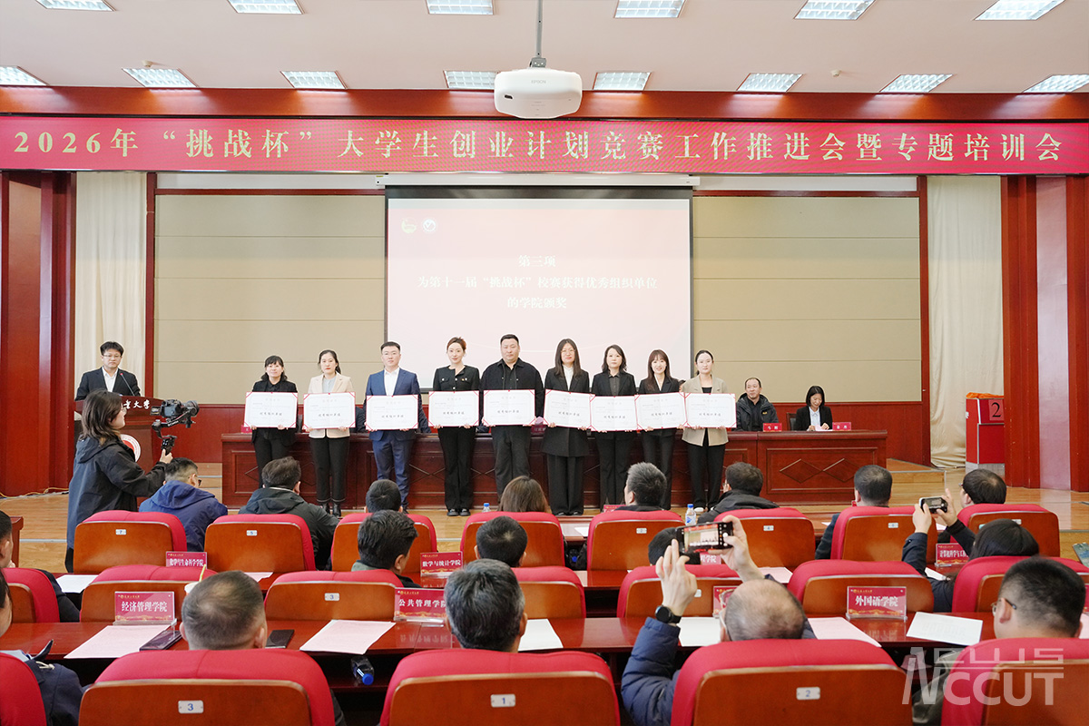 与会领导为学校第十一届“挑战杯”竞赛获得优秀组织单位的学院颁奖