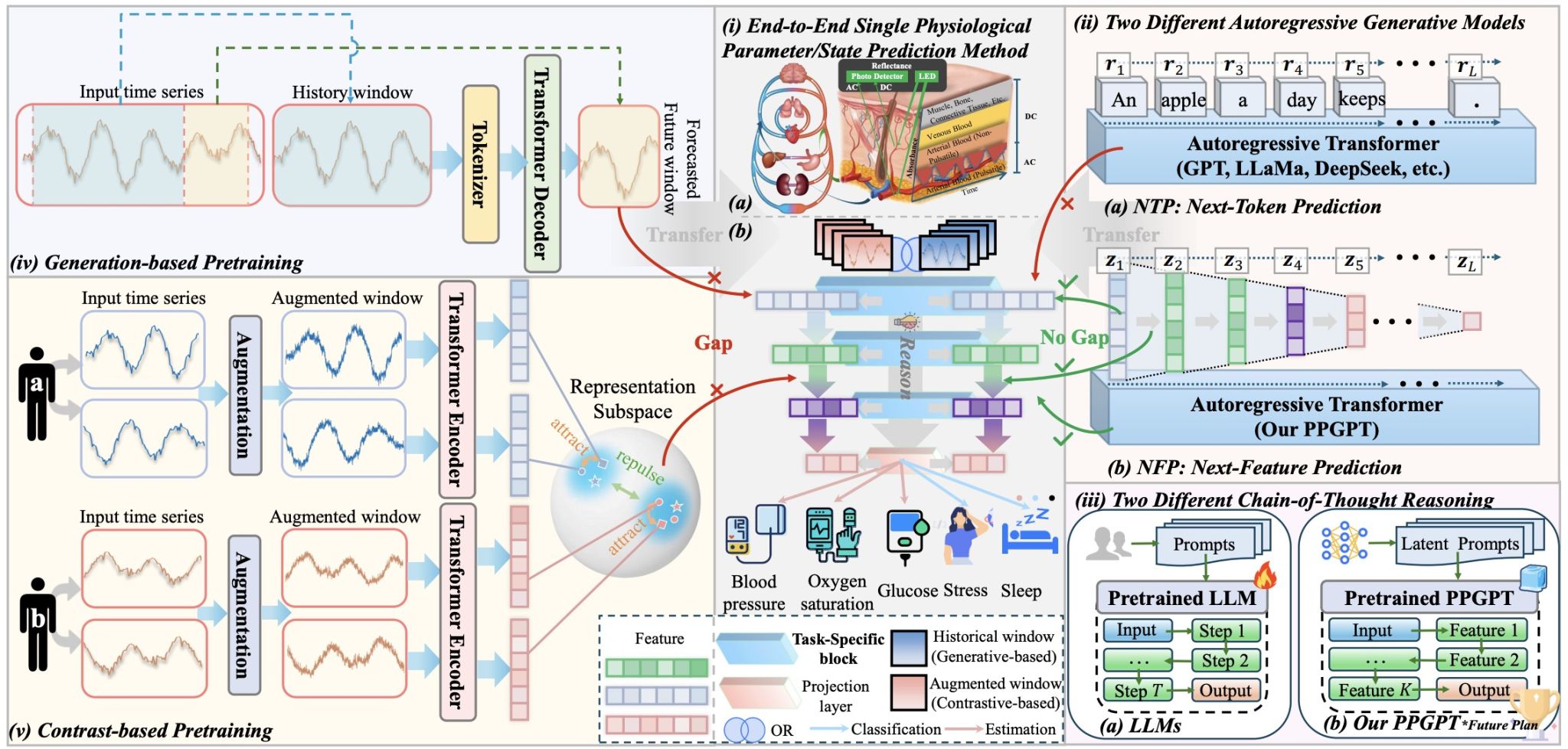 该研究聚焦可穿戴设备中的光电容积脉搏波(PPG)信号建模,探索大语言模型词元预测机制向生理信号分析的迁移。针对预训练目标与下游生理参数估计、状态识别任务之间的语义鸿沟,团队提出首个基于序贯征元预测机制的信号大模型PPGPT,将离散文字序列建模拓展为连续生理信号时空演化轨迹的概率建模。模型采用双流编码器联合刻画时序动态特征与局部-全局形态模式,并基于包含16亿数据点的大规模混合数据集进行两阶段训练。实验结果表明,PPGPT在F1分数上显著优于现有方法16.5%,平均绝对误差降低25.9%,并展现出优异的少样本学习能力。