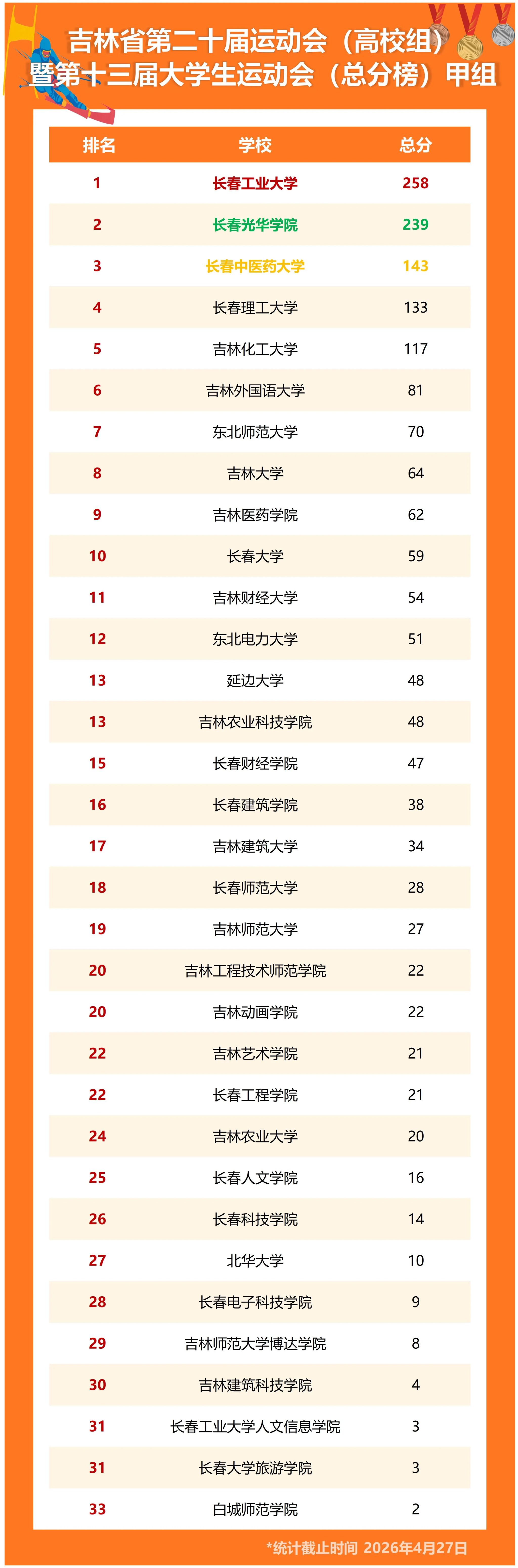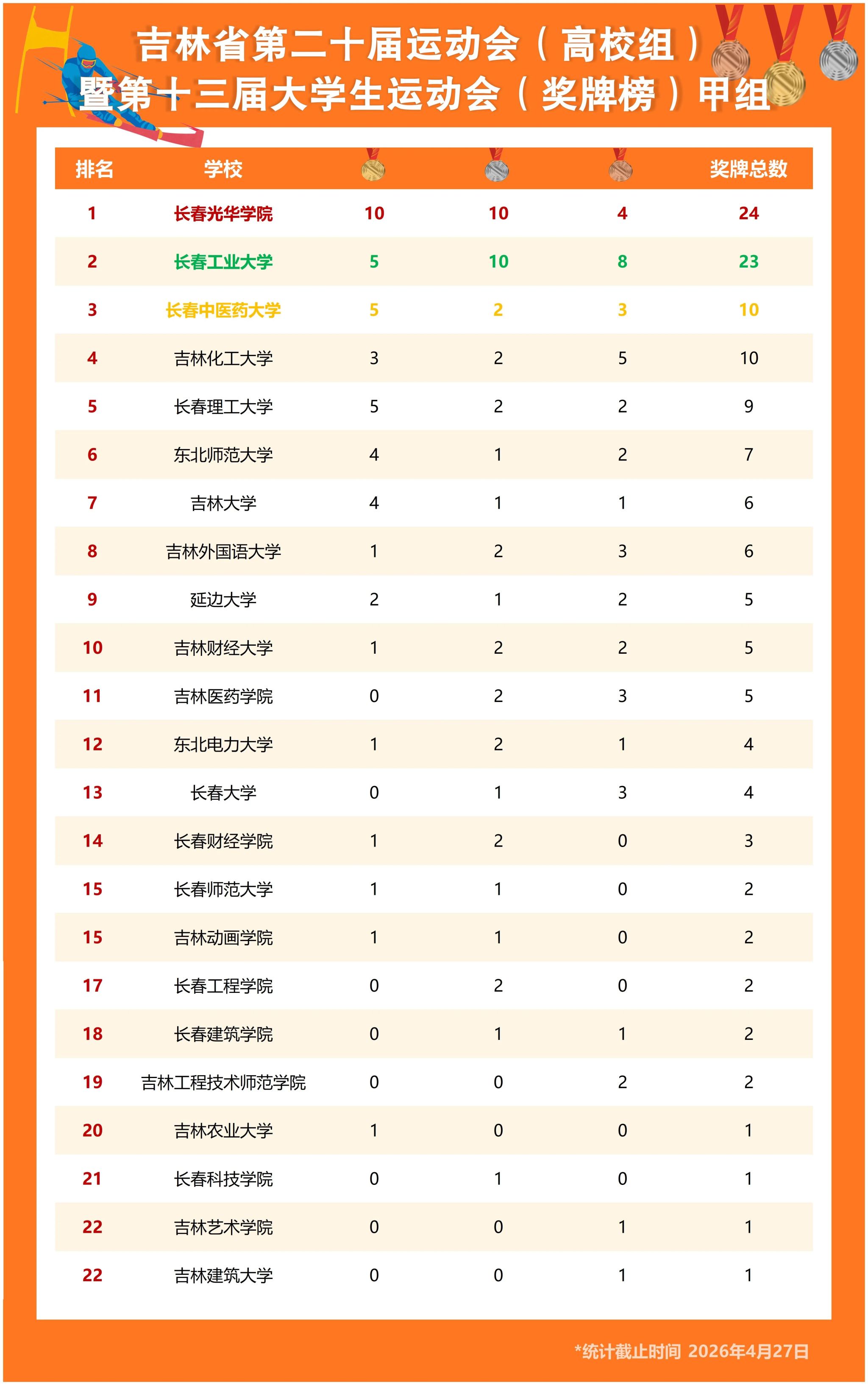 新闻网讯(通讯员 奚明秋)近日,我校参加的吉林省第二十届运动会(高校组)暨吉林省第十三届大学生运动会第一阶段比赛赛事已基本结束。在已结束的单板滑雪、越野滑雪、速度滑冰、武术、男子排球、女子排球、健美操、羽毛球8个项目的比赛中共斩获金牌5枚、银牌10枚、铜牌8枚,总积分258分,位居甲组奖牌榜第二名、积分榜第一名。