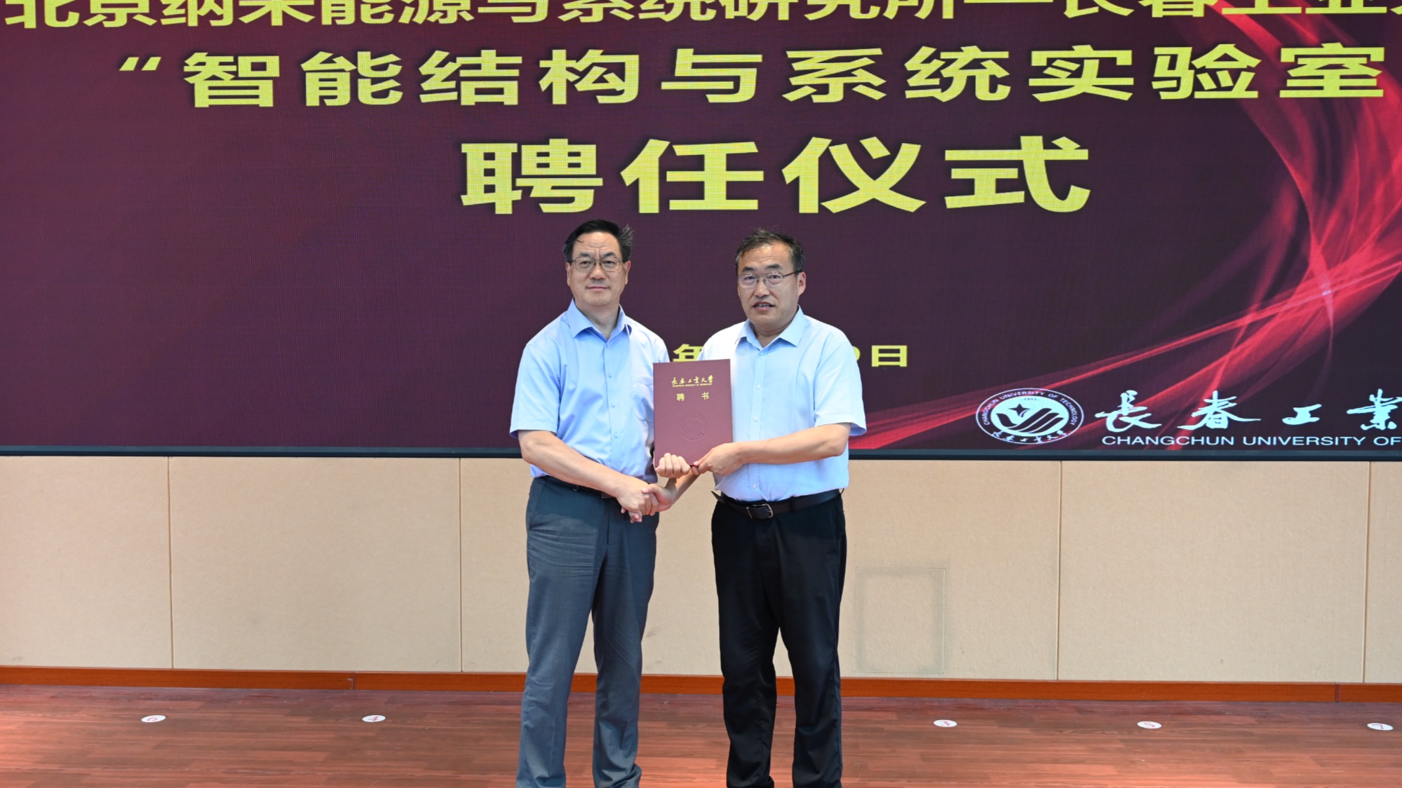 仪式上,双方领导签署北京纳米能源与系统研究所与长春工业大学共建“智能结构与系统实验室”框架协议,并为实验室揭牌。张明耀聘任林洁琼、程廷海为实验室主任,并宣布实验室学术委员会名誉主任及七名专家为校外研究生导师的聘任并颁发聘书。