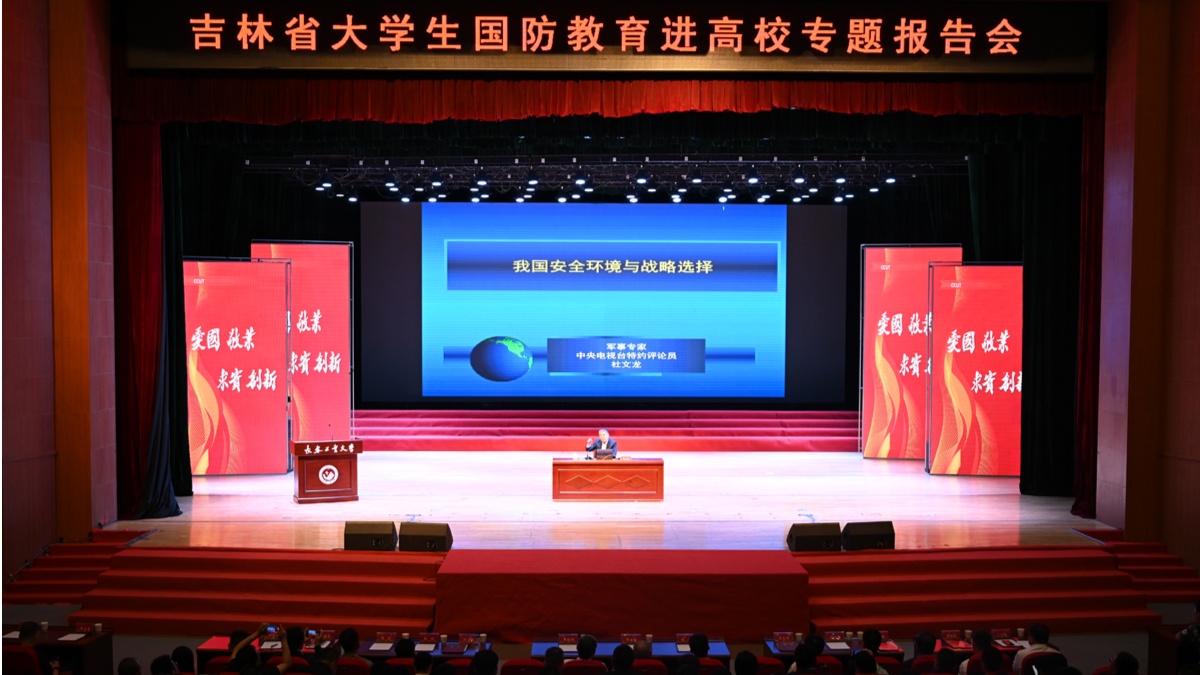 为纪念中国人民抗日战争暨世界反法西斯战争胜利80周年,深化高校国防教育工作,厚植新时代大学生爱国拥军情怀,6月11日,长春工业大学与吉林银行股份有限公司、吉林省高等教育学会国防教育专业委员会共同主办“吉林省大学生国防教育进高校专题报告会”,邀请国内著名军事专家杜文龙研究员、教育部高等学校军事教育指导委员会委员李先德教授作报告。